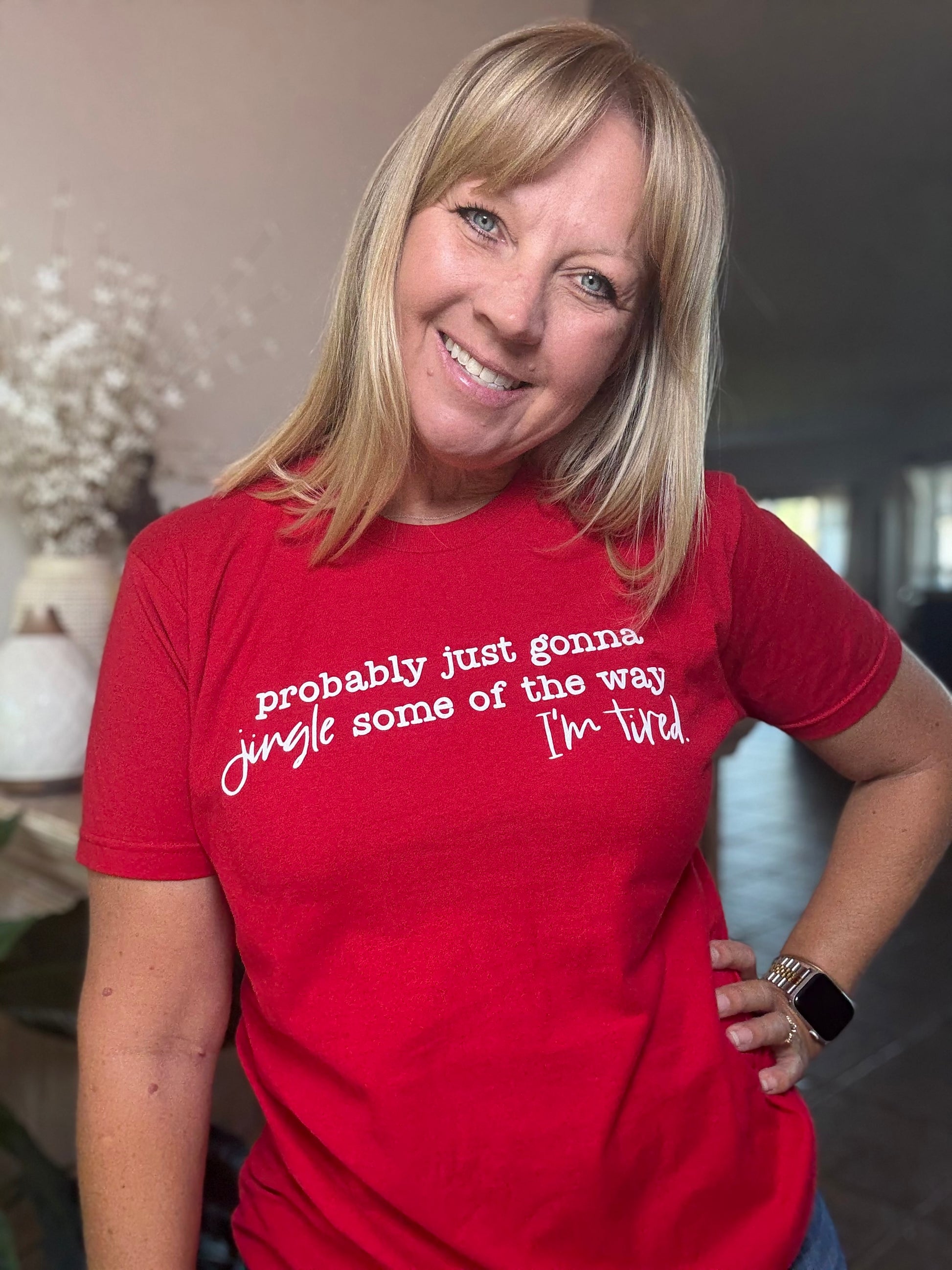 For those of us embracing the holiday hustle with a little less jingle and a lot more “I need a nap,” this tee says it all! Featuring the playful phrase “Probably just gonna jingle some of the way... I’m tired” on a bold red short sleeve tee, it’s the perfect mix of festive and relatable.