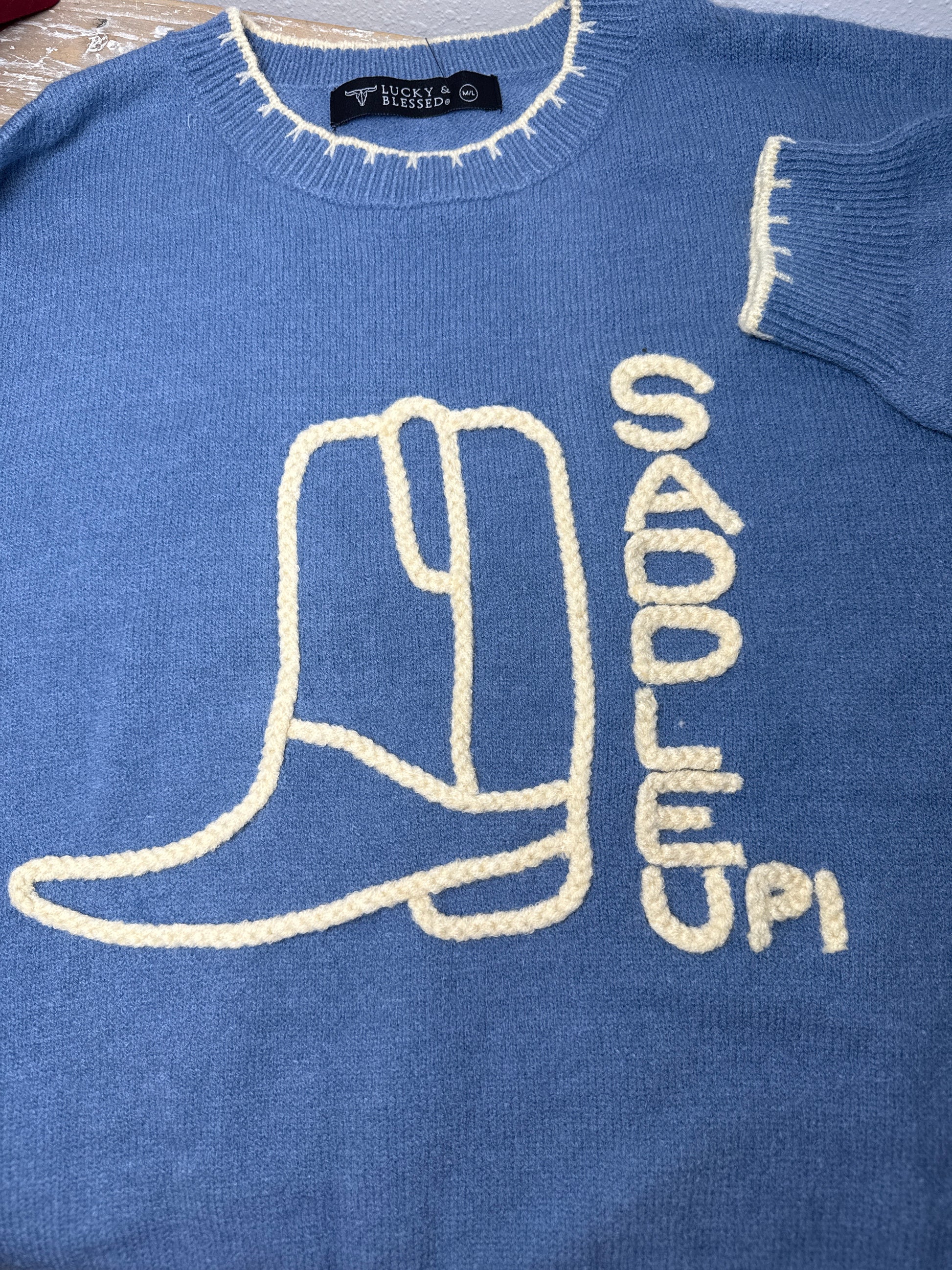 Cozy up in style with this stunning soft knit sweater in a gorgeous shade of blue that’s sure to turn heads this season! Featuring accent stitching along the sleeves, waist, and collar, this piece is all about the details. The standout feature? A single boot stitched with “Saddle Up!” beside it, designed with a 3D effect that adds a unique, eye-catching touch.