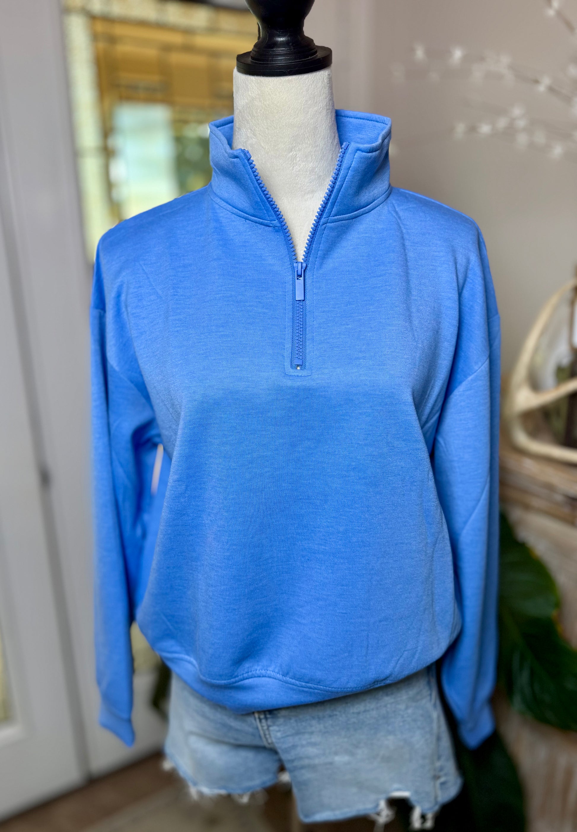Elevate your wardrobe with our 1/2 Zip Cornflower Blue Scuba Pullover. This stunning piece combines vibrant color with practical design, making it a standout addition to any closet.